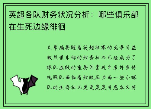 随着英超联赛的竞争日益激烈,俱乐部的财务状况已经成为了球队成败的重要因素。近年来,许多传统强队面临着财政压力,而一些小球队的生存状况更是岌岌可危。本文将从四个方面分析英超各队的财务状况,重点揭示哪些俱乐部正在生死边缘徘徊。首先,本文将探讨收入来源的多样性以及它们对俱乐部财务稳定性的影响;接着,分析高额薪资支出与财务压力之间的关系;然后,研究债务问题与俱乐部财务健康之间的联系;最后,考虑疫情后恢复情况对财务状况的影响。通过这些角度,我们能更全面地了解哪些俱乐部正面临财务危机,哪些又能够通过改革和合理管理走出困境。